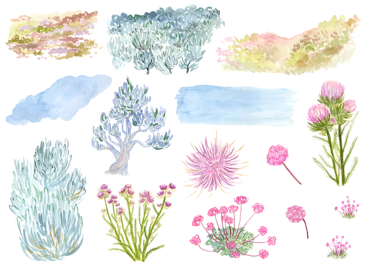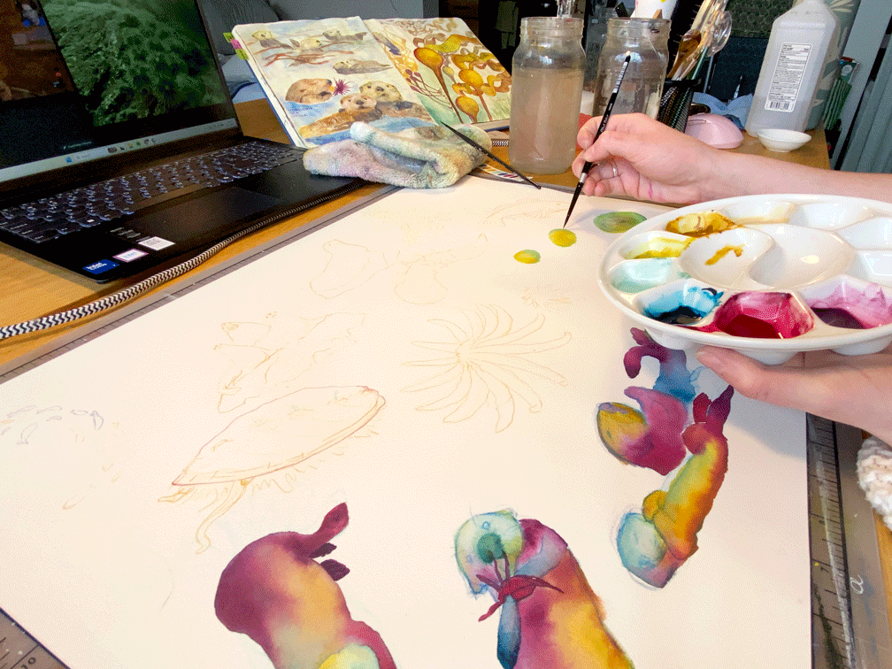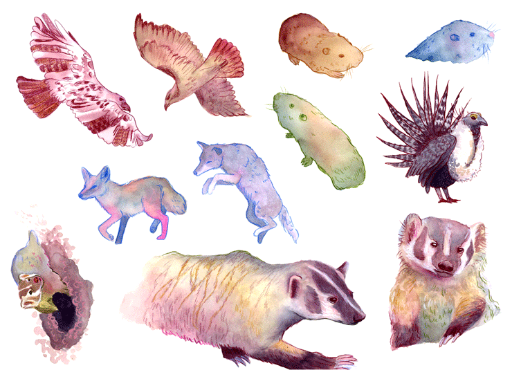 A series of digitally collaged watercolor paintings highlighting Pacific Northwest keystone species, portraying interconnectedness and inspiring ecological awareness.